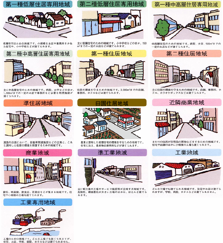 実は、都市計画のひとつ「用途地域」が関係しています。私たちは普段あまり意識しませんが、市街地には、用途地域という制度により、場所ごとに建物の用途が制限されています。第一種低層住居専用地域から工業専用地域まで、13種類の用途地域があるのですが、そのうち、混在を許容するのは、真ん中辺りの住居地域、商業地域、準工業地域くらいなのです。