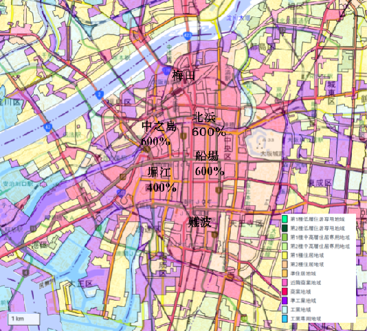 一方、大阪都心は高容積率の商業地域が主体で、用途混在には向かないエリアとなっています。実際、中心部の船場や心斎橋、中之島には、東京都心のような低層の用途混在ビルはあまり見られず、単一用途の高層オフィスが林立しています。