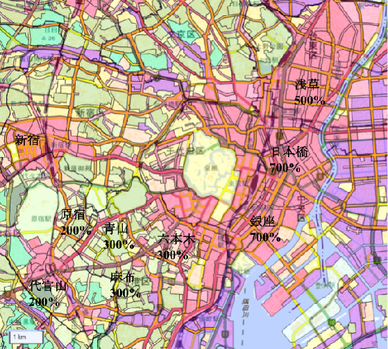 そもそも、東京都心の繁華街は、戦前まで、銀座、日本橋、浅草が主体でした。実際、その辺りは、他の大都市と同じ、商業地域の高容積です。だから、低層の街並みはあまりない。