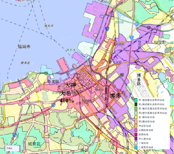 名古屋都心部、福岡都心部も、同様に高容積率の商業地域が主体で、用途混在には向かないエリアとなっています。東京、大阪、名古屋、福岡、主要な都市の都市計画を見ると、いかに東京都心西部が特殊なエリアであるかが良くわかると思います。