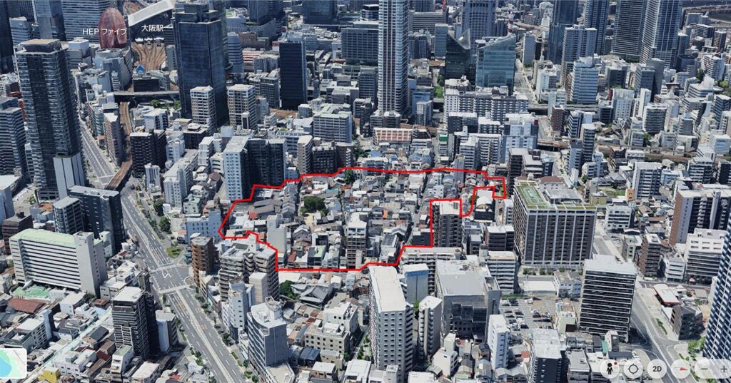 この航空写真は大阪市中崎町を北東側から鳥瞰したものですが、建物高さが低く小中規模の建物が集積していることがわかります。また中心部にある駅から徒歩10分から15分で訪れることができるエリアであり、歩行者も少なくありません。