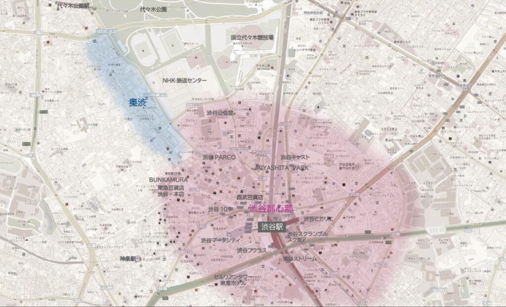 渋谷駅から徒歩15分強、代々木公園の南西側に位置します。渋谷の喧騒から離れた立地にあることからその名前で呼ばれるように。「奥神楽坂」「奥原宿」「奥代官山」などと同様、主要駅などある中心から少し離れた洗練されたエリアを意味します。