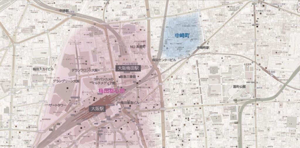 梅田と中崎町の間にある茶屋町は、1990年代から開発が進み次々と建設が行われて梅田の繁華街が拡張されました。一方、戦災を逃れた中崎町では高齢化が進み、空き家・空き店舗が多く、開発から取り残されていたのです。