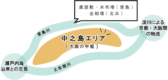 当時の蔵屋敷には全国の米や物産が集まるだけでなく、ヒト・チエ・情報も集まってきました。堂島の米市場や北浜の金相場とあわせて中之島エリアは日本の中で最も先端のビジネス・スキームを創造する場所だったといえます。