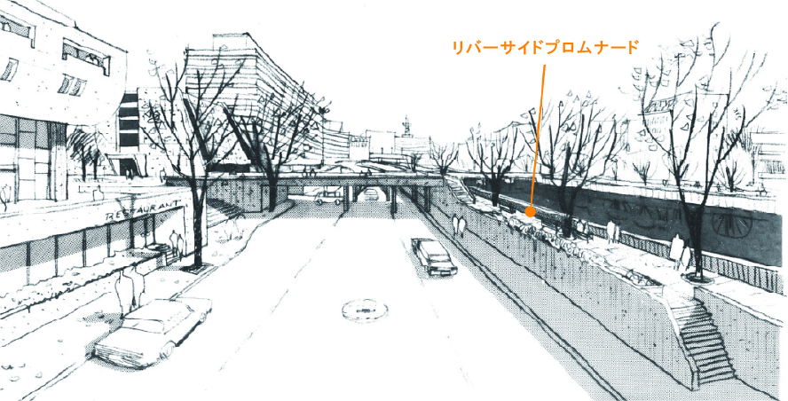 これらの計画では、防潮堤が川の景観を阻害しており、川沿いの街としての魅力が生かされていないことを問題視し、防潮堤レベルに散策のためのリバーサイドプロムナードが提案されました。