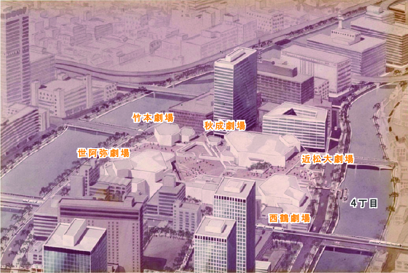 「中之島芸能センター構想」は、関経連により発表(当社支援)されたもので、4丁目街区全体に大中小と計5つの劇場を設け、歌舞伎や能・狂言、日本舞謡といった伝統芸能から、オペラ、ミュージカルにモダンダンスなどあらゆる芸能を上映する壮大な計画となっています。上方芸能の礎を築いた人物の名を冠している点も特徴的でした。