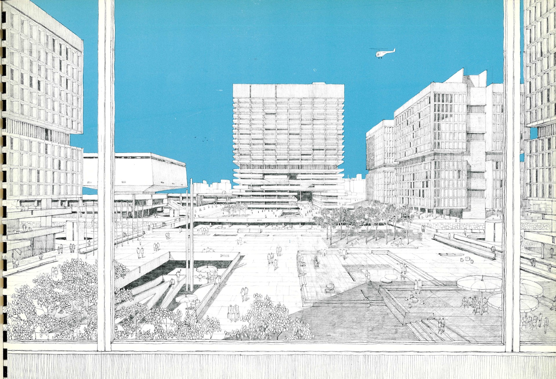 「中之島芸能センター構想」を4丁目に取り込み、前段の「中之島再開発計画」で検討された歩行者ネットワークの考え方を踏襲しながら実現に向けてより精緻な検討がなされました。パースも1965年からより具現化されています。