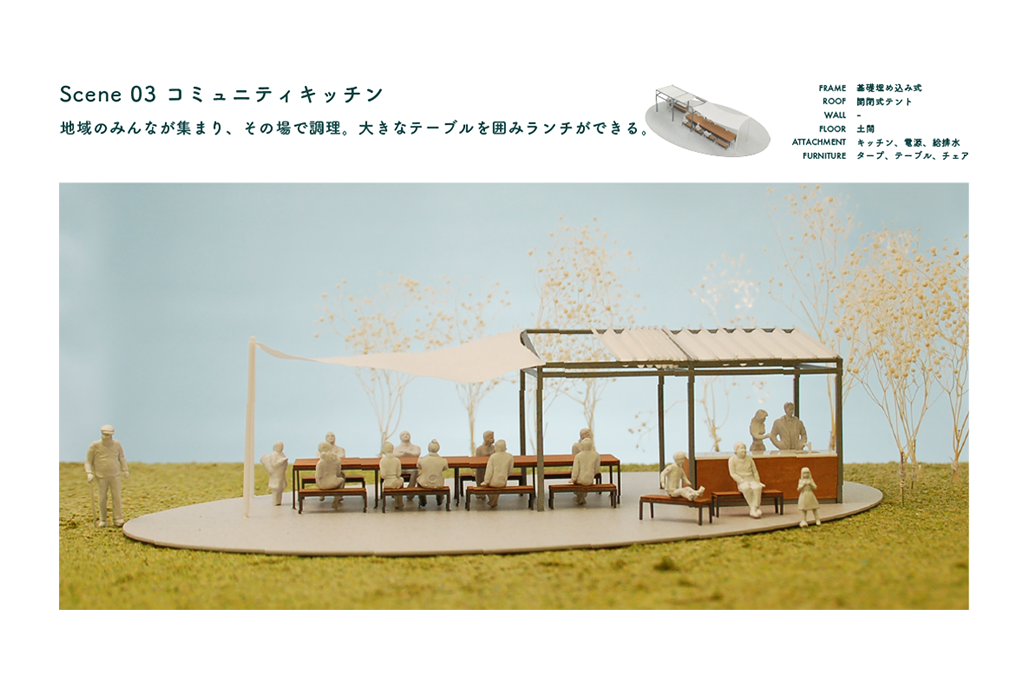 3つ目、コミュニティキッチンとして利用される『PLOT』では、簡単な調理に必要な給排水機能を設けるほか、屋根にタープなどの膜素材を用いることで、利用する人数によって簡単に居場所を拡張できます。
