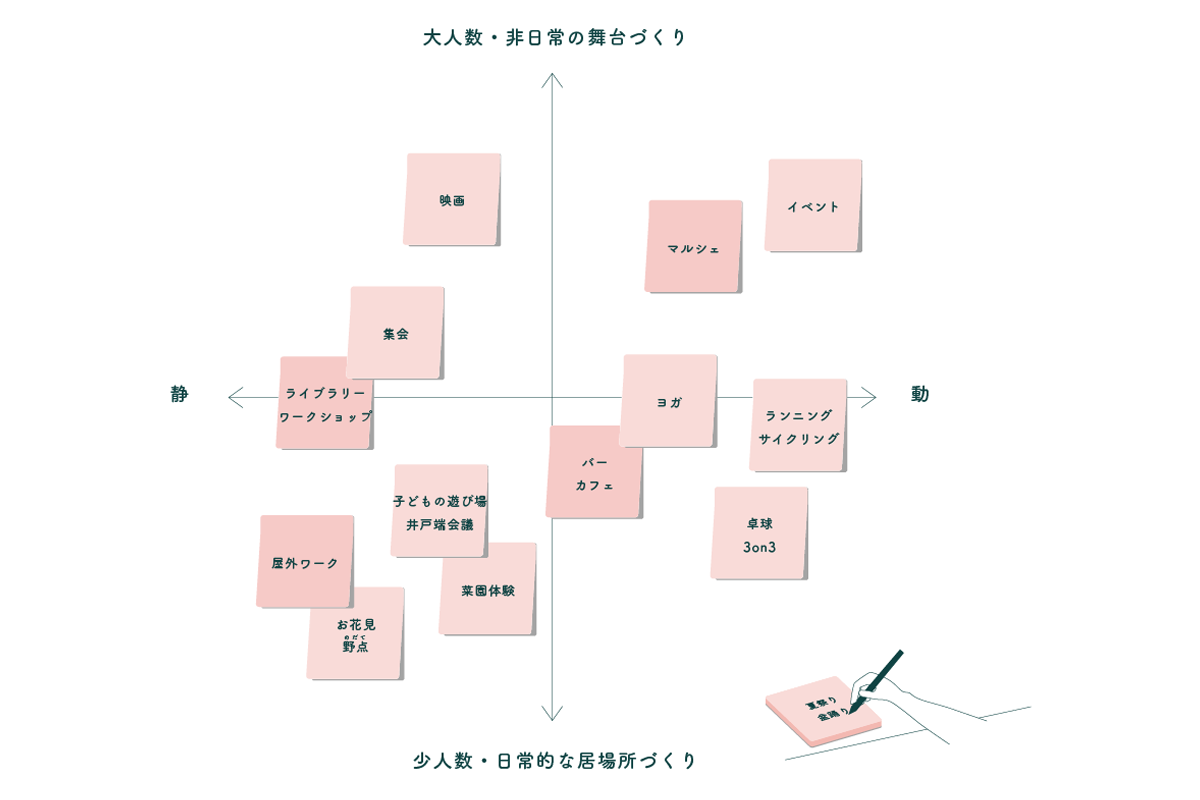 不特定多数の方が思い思いに過ごせる「公園」という場所の可能性を拡げることを目指し、『PLOT®』の企画開発は、公園でやってみたいアクティビティをディスカッションするところから始めました。屋内で実施するいつもの活動も、公園で実施することで特別な体験となります。